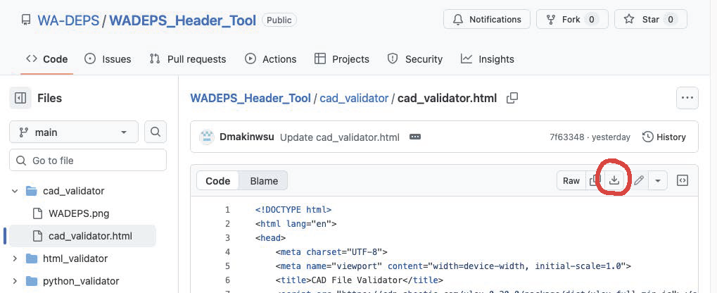 3. In the upper right of the main window, click the “download” icon (the downward arrow pointing into an open box). The HTML file should automatically download to your computer with the name “cad_validator.html”.