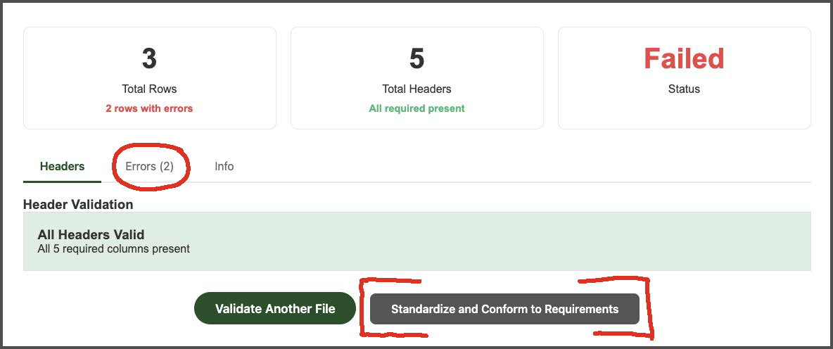 * The “Headers” tab in the lower left indicates any errors in the required header spelling and format.